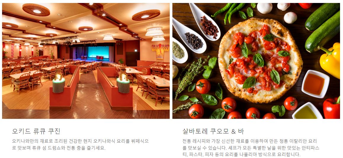 공식 홈페이지에 나와있는 레스토랑 정보입니다. 뷔페식인 아쿠아벨, 일식당 운카이, 류큐 전통 춤을 보면서 식사할 수 있는 오키드 류큐 쿠진, 이태리식 살바토레 쿠오모 등이 있습니다.